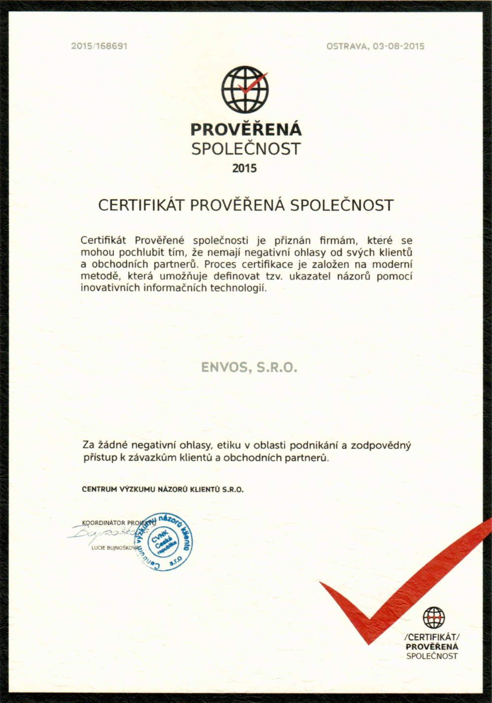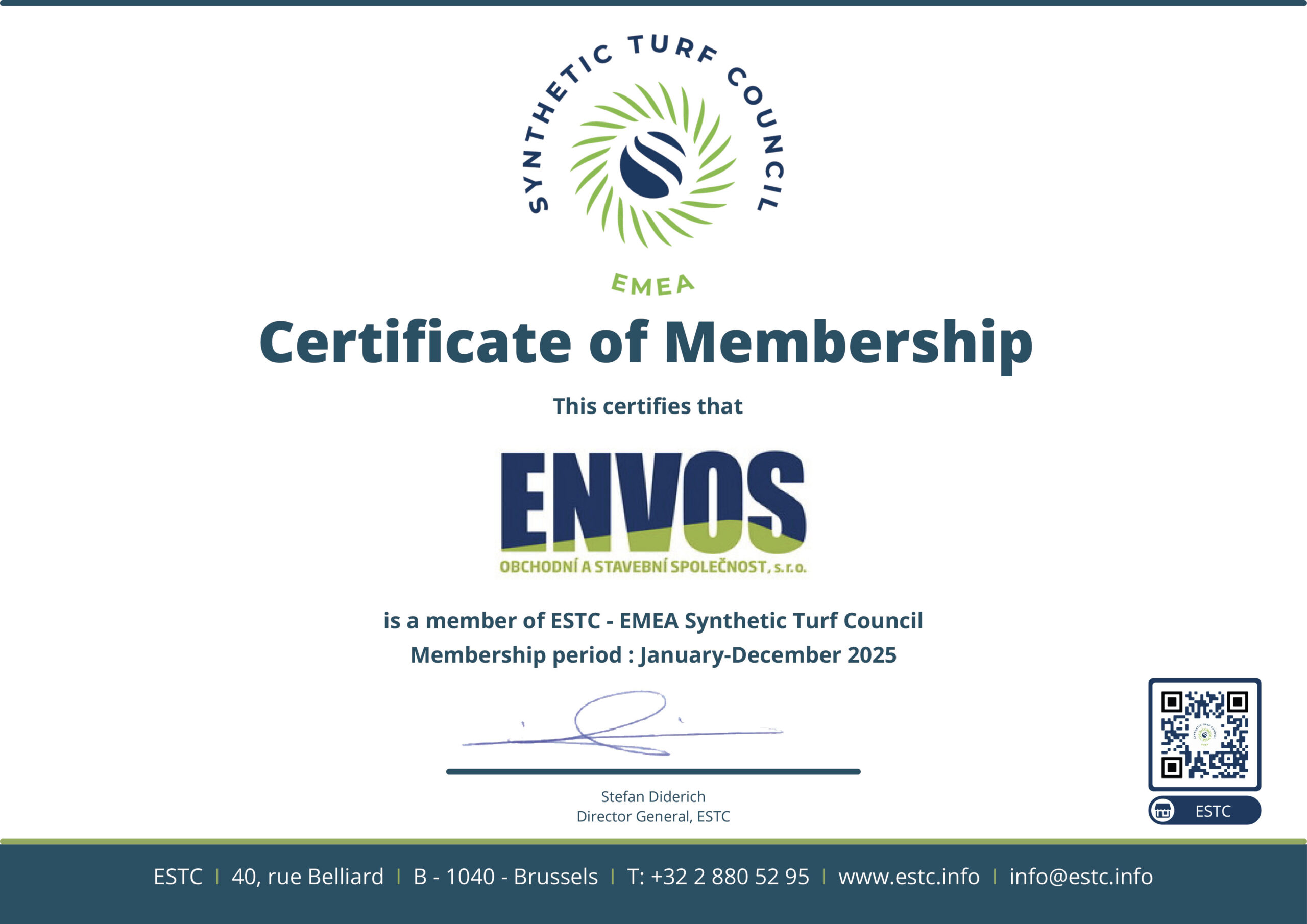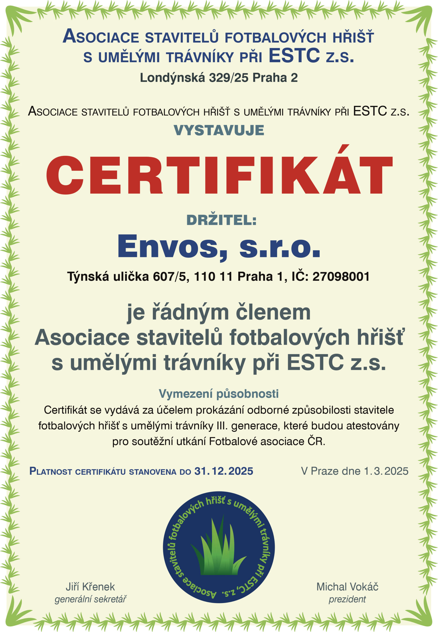 CERTIFICATES Certificate ESTC Certificate Asociace UT3G ČSN EN ISO 9001:2016 ČSN EN ISO 14001:2016 ČSN EN ISO 45001:2018 Envos - Extract from the List of Qualified Suppliers Verified Company
