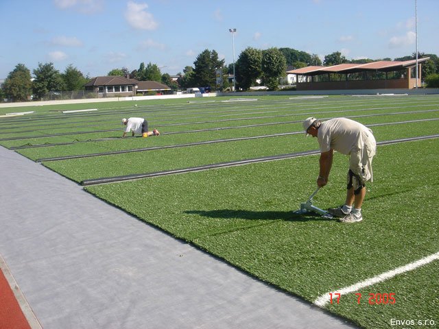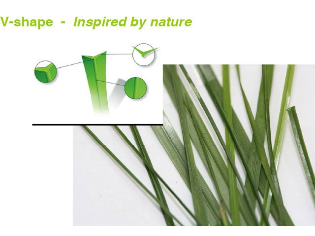 Currently, we most often install V-shaped memory fiber turf carpets on soccer fields. V-Shape and V-Slide products. The advantage of reinforced profiled fibers is their ability to return to their original position after being bent by foot traffic or vehicle traffic.