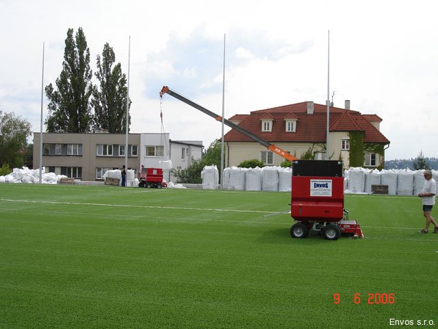 We install and maintain soccer fields using special equipment from SMG. We use a Sandmatik machine to fill the field with sand and rubber granules, which performs three functions simultaneously during filling. Brushes lift the grass fibers, the filling is performed, and the filling is immediately brushed out by other brushes. For the maintenance of artificial football pitches, we use a Sport Champ tractor, which has several types of attachments for cleaning and loosening the granules to keep the pitch soft and flexible. It also includes several types of brushes for re-leveling the playing surface and removing coarse debris. We recommend performing this medium-term maintenance at least twice a year. Maintenance may also include replenishing the granules, which should be done mainly after winter, when a certain amount of granules are removed from the field when using a cutter and plow.
